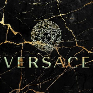 Pomaikai Barron draws from high-end fashion to craft digital pieces like Versailles I, where the iconic Versace Medusa emerges on a cracked black marble backdrop with gold accents. This print brings chic sophistication to walls, blending luxury vibes with bold design that complements modern interiors and adds a daring edge.