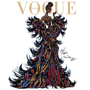 Hayden Williams crafts bold fashion illustrations that capture pop culture glamour. Vogue Africa shows a model in a multicolored feathered gown, blending African motifs with high-fashion flair. This print adds trendy energy to walls, drawing eyes with its dynamic lines and vibrant palette. Shoppers choose it to infuse spaces with stylish confidence.