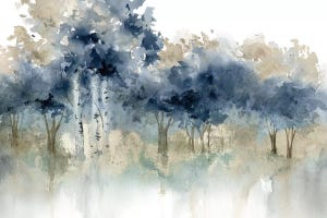 Carol Robinson captures serene landscapes in her watercolor style, as seen in this print of misty trees along a quiet shore. Loose brushstrokes blend deep blues and soft beiges, creating a reflective composition that evokes calm. Customers appreciate how this watercolor trees print softens a room and pairs well with modern decor, adding a touch…