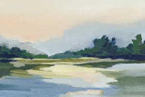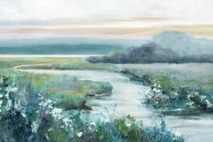 Sally Swatland crafts scenes that recall simpler times, as seen in this twilight landscape painting. The print shows a winding river through marshland landscape, with soft brushstrokes blending greens and pastels under a fading sky. It brings calm to living rooms or offices, drawing viewers into peaceful reflection. Customers choose this print to add subtle…