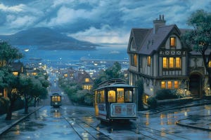 Evening Journey by Evgeny Lushpin captures a rainy San Francisco street with cable cars gliding down slick tracks toward the glowing bay. His photorealistic landscape painting style brings intricate details and reflective surfaces to life in this print. The composition draws the eye through layered city lights and misty hills, creating a serene urban escape….