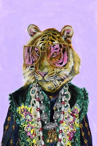 Heather Perry draws from pop culture and fashion in this whimsical print. The anthropomorphic tiger wears oversized sunglasses and layered necklaces over a detailed jacket, set against a soft purple background. Loose brushstrokes and bold patterns create a playful composition that adds fun energy to modern spaces. Customers appreciate how it brings personality to walls…
