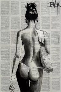 Loui Jover draws with pen and ink on vintage book pages to craft this minimalist portrait. Summertime shows a nude woman walking away, her form sketched in black and white lines over text background. This print adds sensual touch to walls, drawing eyes with its romantic artwork and subtle curves. Customers choose it to bring…