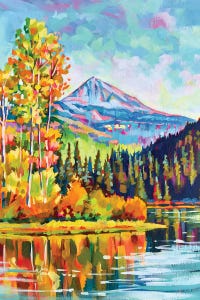 Maria Morris paints landscapes with bold acrylic strokes, capturing Telluride, Colorado in the fall through layered colors and reflections. This print shows a mountain peak rising above a serene lake, flanked by autumn aspens and evergreens. The composition draws the eye across water mirrors and forested slopes, creating a peaceful focal point. Customers appreciate how…